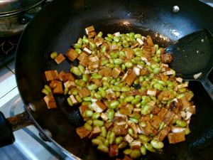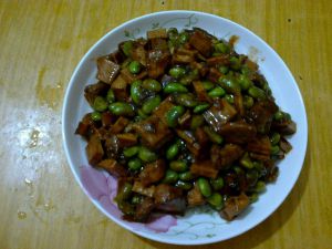 把豆米和干丁一起放入锅里翻炒,加些老抽,炒的过程中淋入少许水,快好时加入盐和鸡精,翻炒均匀,因为有酱,盐要少放一点了。