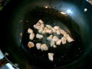 肉丁用盐少量,醋,淀粉,生抽拌匀腌制一会,这样肉不会老。