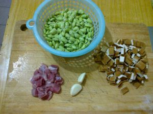 毛豆剥好洗净,香干切丁,肉切丁,蒜切碎。