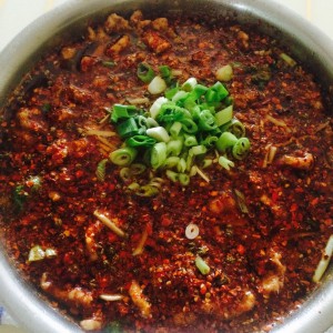 最后一步就是将干辣椒粉,花椒撒在肉上边,把油烧热(扔两颗花椒进去有炸开的感觉)后倒在辣椒粉上,再撒上葱花点缀