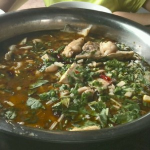 大火锅里烧热,不能有水;倒入适量菜油、用锅铲将锅一周淋上油;等待油接近于燃点(燃了也无所谓)放入备用的姜蒜、葱头、干红椒、花椒;翻炒下(几秒钟即可,时间久了干红椒会糊,煮出来的鱼不好吃)加入适量郫县豆瓣再翻炒下(10s左右)再加入酸菜翻炒30s加入适量水