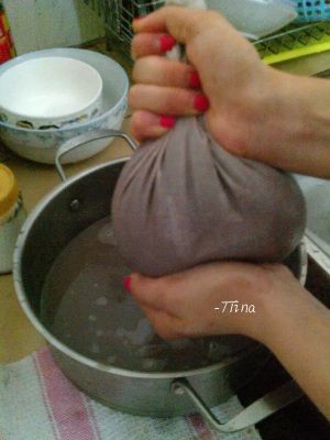 按压后,用干净的纱布或者滤纸袋,装入豆沙连水分一起装入。