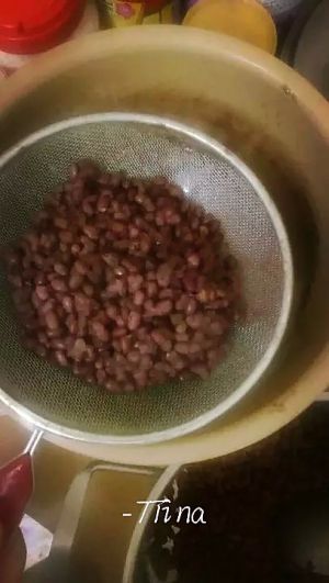 将细网筛置于器具上,舀适量煮熟的豆子到网筛中。