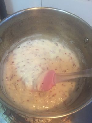中间少了一张照片。玉米淀粉加入一半的牛奶搅拌均匀,再依次加入包括另一半牛奶的其他(除蔓越梅)材料搅拌,上锅小火熬煮,注意一边搅一边煮,不然容易糊锅。