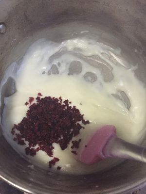 糊状时加入蔓越梅继续搅拌均匀,盛入方形盒子中放凉(盒中可先放入油纸铺垫,方便最后取出)