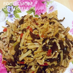 加入冬笋丝和黑木耳丝大火煸炒片刻;倒入已经炒好的肉丝