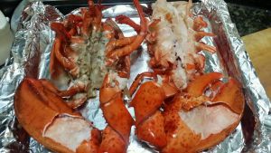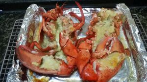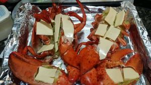 将炒好的蒜蓉均匀的放在龙虾肉上,再将芝士片撕成小块,放在龙虾肉上,烤箱200度,预热后放入