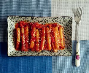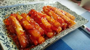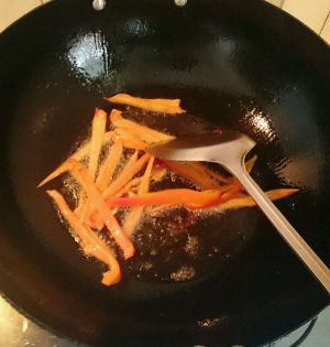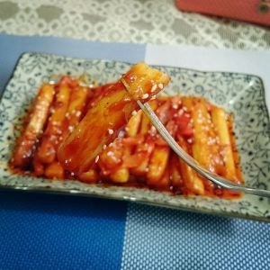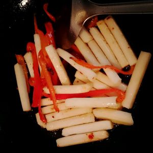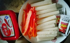 准备好食材,年糕红椒切条。年糕用水泡一会儿!我家里没有多的蔬菜只放了红椒!喜欢辣白菜的可以加进去也可以单独做拌菜吃!