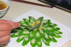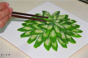 漏勺沥干秋葵水分,然后在盘子里面摆成菊花形状,摆盘的时候外面摆一圈,中间可以用秋葵的头垫着,可以做为第二层铺秋葵时候的"地基"使用。