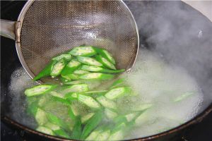 秋葵倒入锅内水再烧开后马上就捞出来,这里要注意掌握时间,煮过了就颜色发黄。