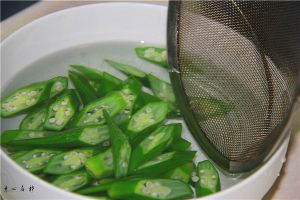 捞起来后马上投入凉水里冷却,以保持颜色和口感,要让秋葵瞬间冷却,这样口感和颜色就能保持到最好。