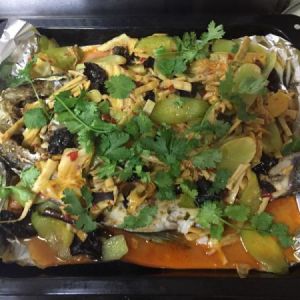 把烤好的鱼拿出,浇上炒好的蔬菜,放上香菜淋上熟油就完成啦