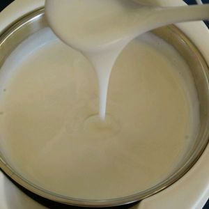 先倒一点和发酵剂搅拌均匀,再把剩下的倒进去。
