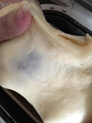 出现这样的规则圆形孔洞的时候,一般甜面包就可以了,继续揉,不久就会出现手套膜。这次的手撕包,为了达到手撕的效果,再揉一会。