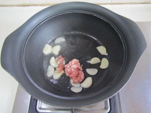 蒜片煸香后下入肉末翻炒;