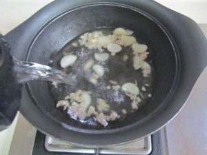 肉末翻炒变色后加入适量的水, 煮上两分钟;