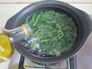 南瓜叶煮变色后再煮一下, 加入少许橄榄油;