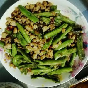 锅中加少许油,油热了以后放入肉末翻炒至熟,再加入刚才炒好的四季豆。放少许盐,混合翻炒一两分钟后出锅!