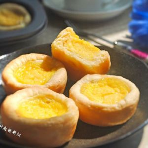 蛋浆倒入到蛋挞皮里8成满,放入预热好的烤箱中层190度,上下火烘烤20分钟。