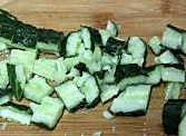 取一根黄瓜,用刀侧面将其从上至下拍碎,再切成小段,放入容器中