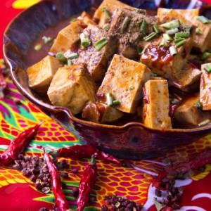 豆腐在盐水中浸泡半小时后切成小块。蒜切片、姜切茸、葱花备用