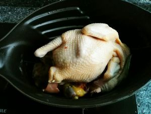 光鸡清理好腹腔里的油,鸡血,洗净沥干水。加入盐焗鸡粉,用几根香葱蘸着粉均匀涂抹鸡内腔,表皮,揉搓按摩5分钟,把葱塞进鸡肚子,放置腌制20分钟左右(有时间也可以多腌一会儿)。锅底铺满香葱(用绿的部分,葱白留做蘸碟),鸡脚弯曲塞进肚子里,放进锅里,淋米酒。