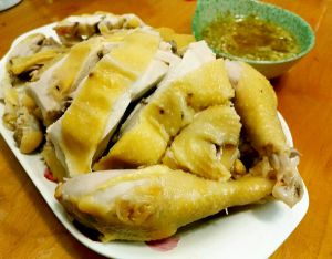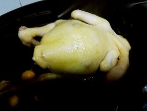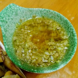 在鸡取出放凉的时候,切葱白末、姜末、沙姜末,用热油爆香,加焗鸡锅里的鸡汁,再加一点盐焗鸡粉,调到咸淡合适,就成了蘸碟。