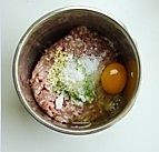 在肉里加入盐、鸡精、少许糖、料酒、香油、一个鸡蛋,葱末姜末,然后顺一个方向搅拌至起粘上劲。