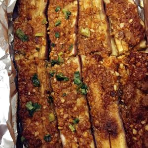 铺上炒好的蒜末肉末,盖上铝箔纸,烤箱220度20分钟