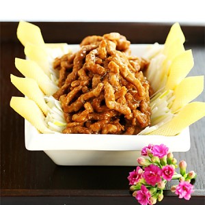 最后将豆腐皮摆到盘中,再摆上一层葱丝,盛入里脊肉丝即可。