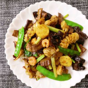 腩肉炸些油出,再放入虾、鱼丸、蚝、鱿鱼一起炒好,放入盐.白糖.酱油炒入味,备用。