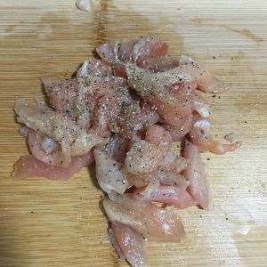 鸡胸肉切小块,放盐、胡椒粉腌制。