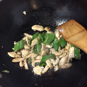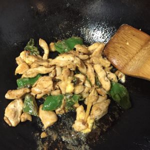 热锅加入适量橄榄油,先煸炒配料再加入鸡肉,不停翻炒至鸡肉熟时青椒也变成“虎皮”状了。加入一小勺酱油、根据自己口味加盐加点点胡椒粉。