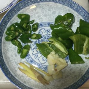 腌制鸡肉的时候可以把尖椒切小小段(方便入味);青椒切大段(方便煎成“虎皮”壮);蒜切碎,姜切丝。