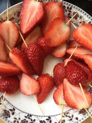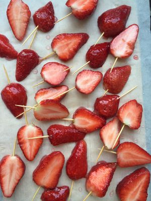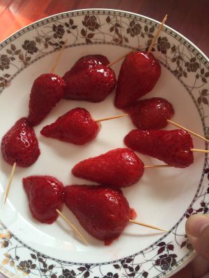 凉透了以后放入冰箱,待草莓上的糖冻上了,刚好拿出来。