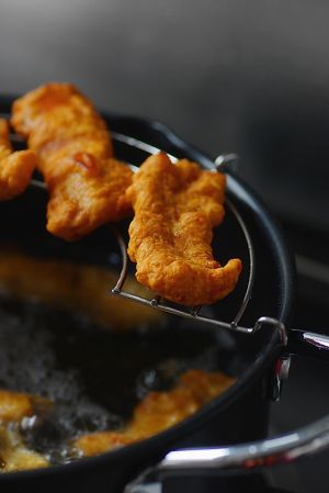 5.起油锅,待锅底开始冒气泡,转中小火,分批油炸至颜色金黄,捞起。