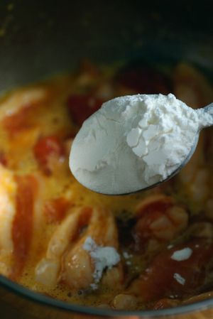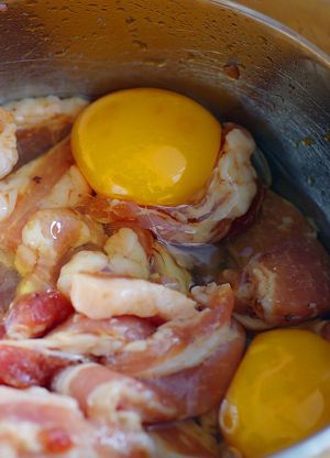 3.将古龙天成酱油、料酒、糖、盐、2个鸡蛋,全部加入,并搅拌均匀,