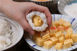双手沾上适量水,再取适量热米饭铺于手掌中,包入乳酪丁