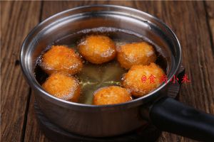 锅中倒入7分满的沙拉油烧热至170度,将沾有面包糠的饭团放入油锅中,以中火炸至呈金黄色且浮上油面,即可捞出沥干油分,趁热食用