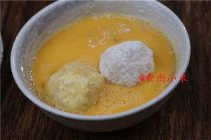 将鸡蛋打撒成蛋液,饭团滚入蛋液中沾滚均匀