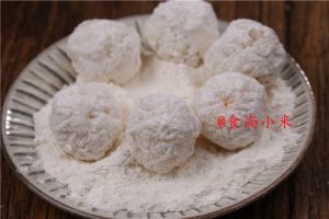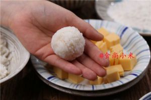 在乳酪饭团表面均匀地沾滚上面粉