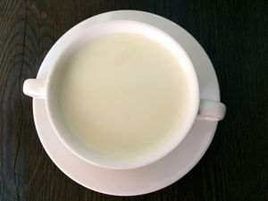 这时候的牛奶刚刚好将奶杯提高让牛奶冲入容器中
