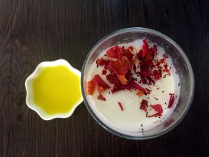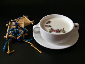 牛奶加入白糖小火加热至沸腾,放入掰开的玫瑰花搅拌均匀,过滤掉玫瑰花留奶(不放玫瑰花牛奶静置一分钟备用)