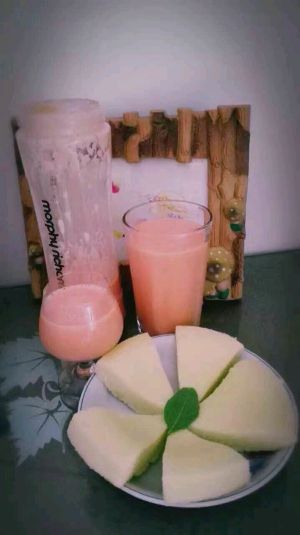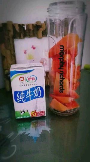 把木瓜去皮 然后切成小块再放在榨果汁杯中 然后把倒入杯中