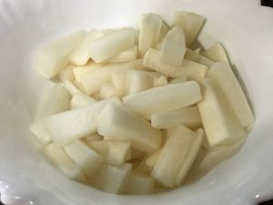 白萝卜洗净切条,用盐腌两三个小时,把水分腌出来不要。