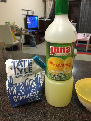 家里吃饭的小碗,半碗糖,加柠檬醋调匀,自己尝一下,口味轻重自己喜欢就好。