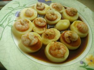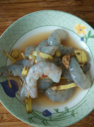 大虾剥壳,用少许料酒,和姜丝腌10分钟
