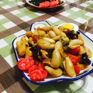 放入猫耳朵煸炒,最后放进木耳煸炒出锅
