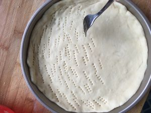 将面片放入披萨盘,用手掌轻轻按压平,用叉子叉上小孔,上下火200度预热烤箱5分钟