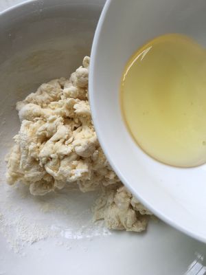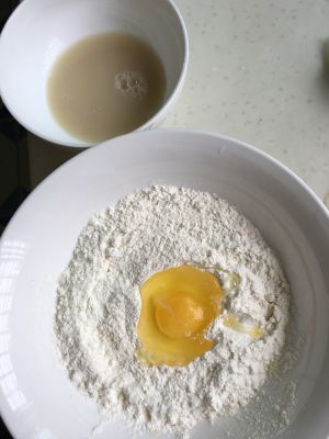 两种面粉混合打入鸡蛋,倒入水和酵母的混合物,搅成絮状